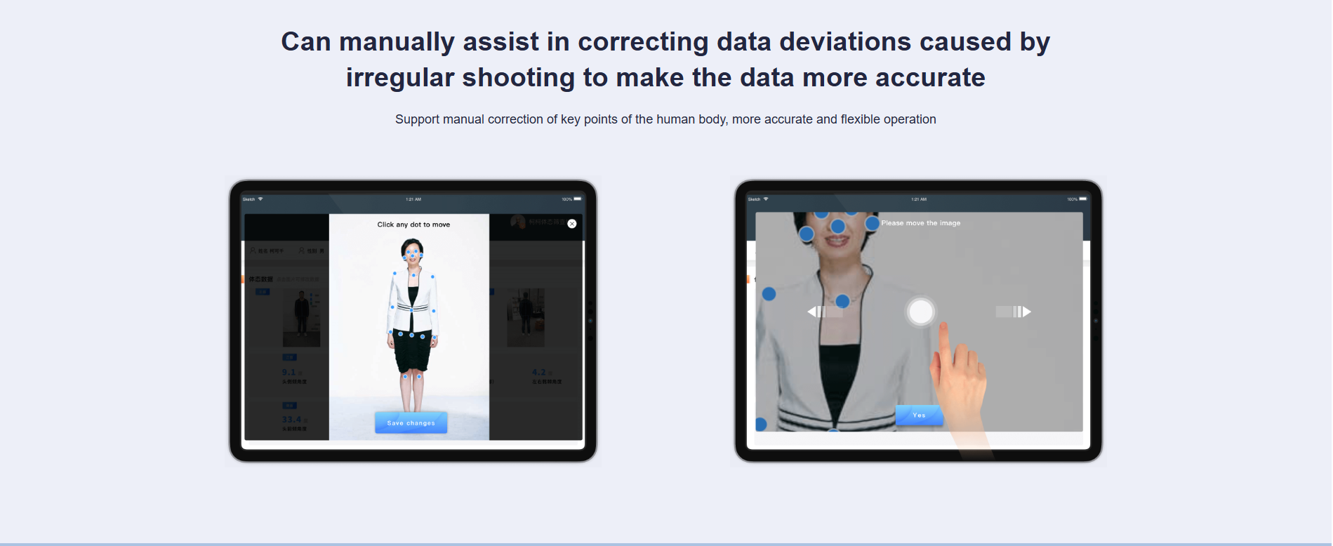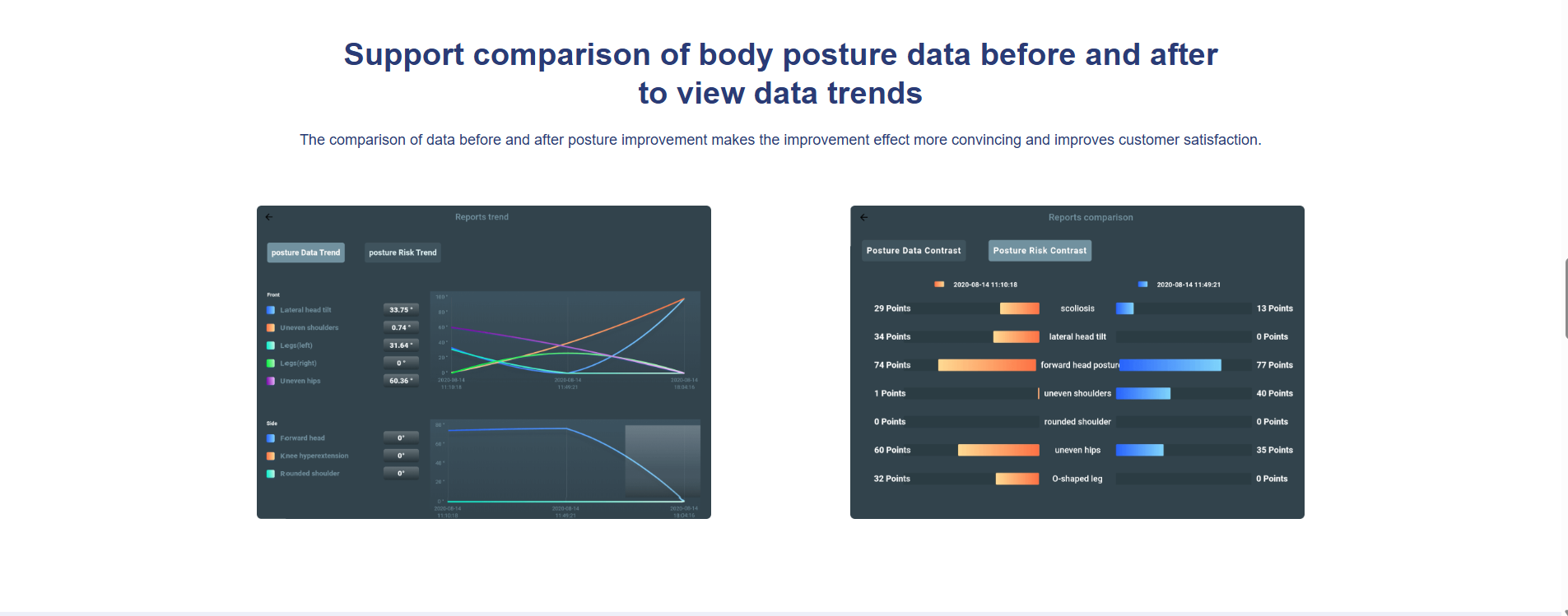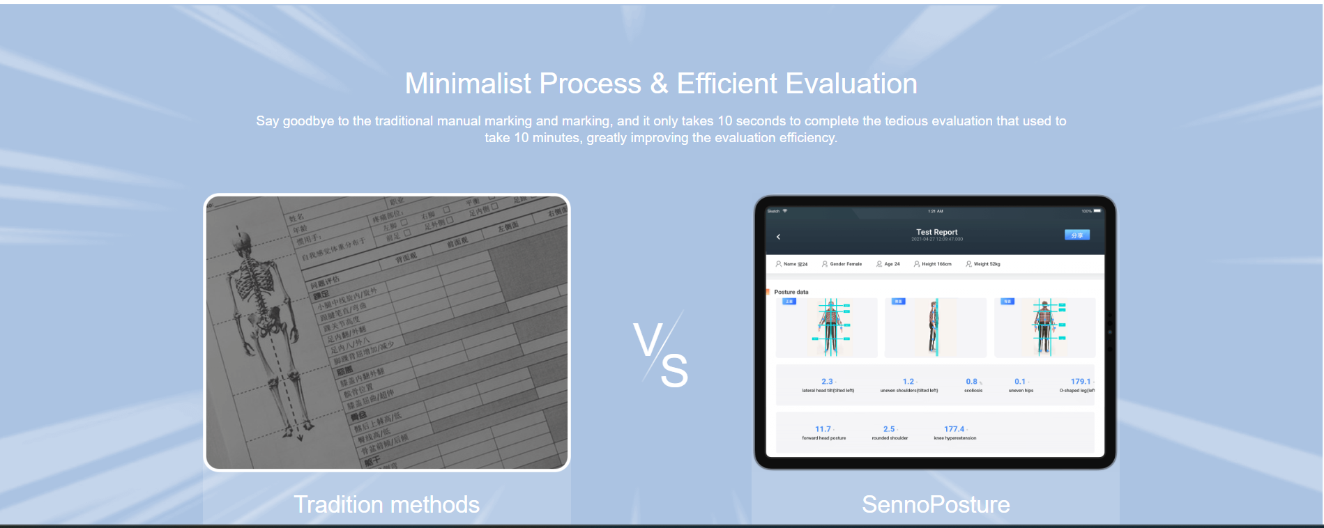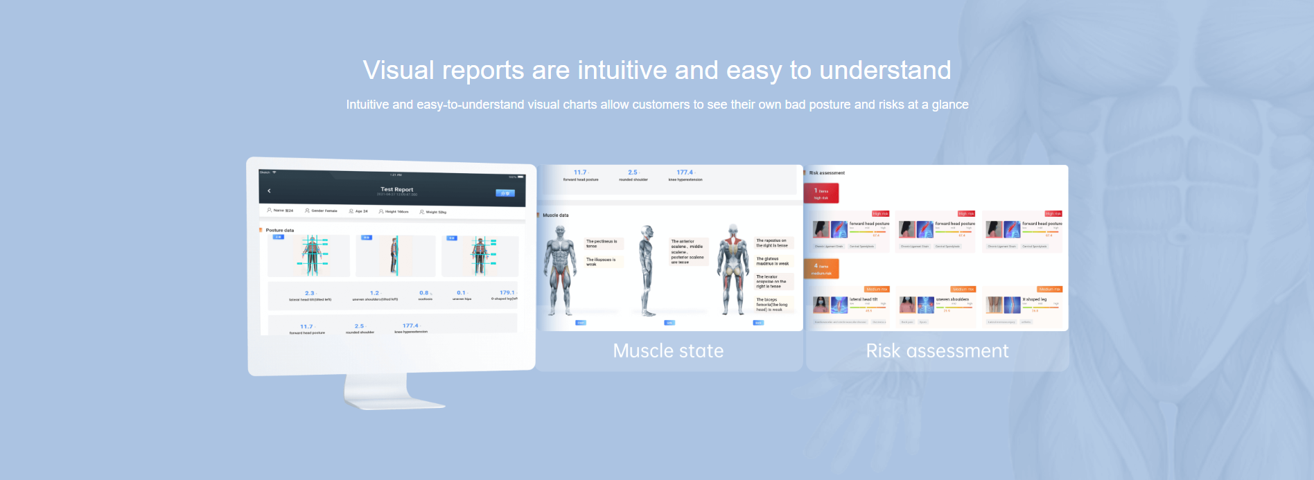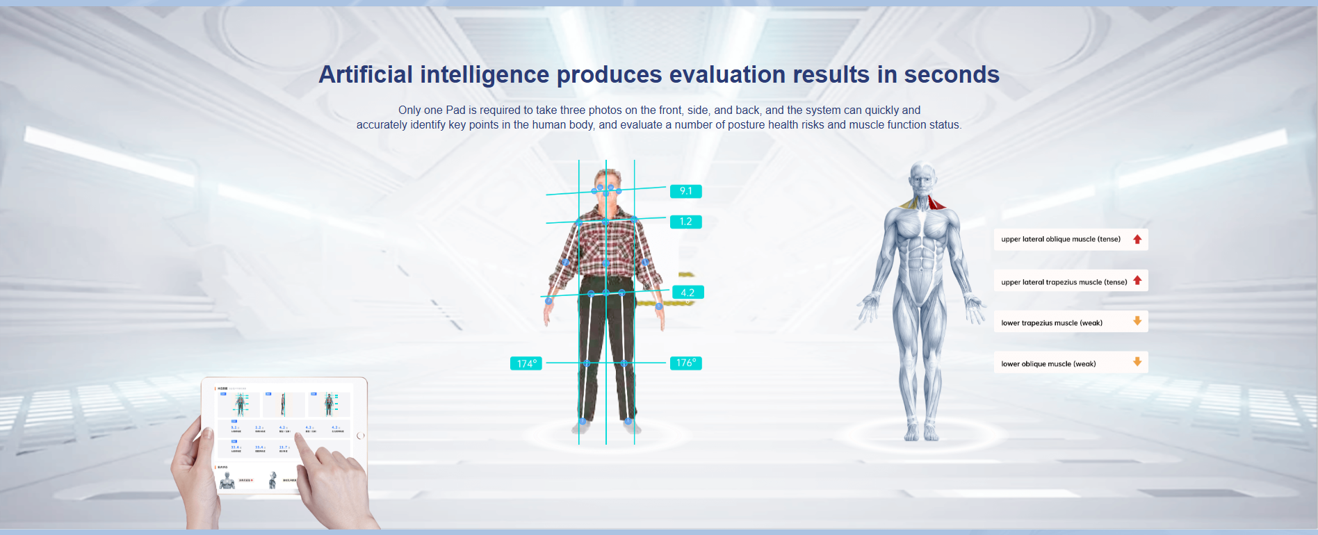 Posture expert is a posture intelligent management system developed by Chuangjian Technology based on artificial intelligence, cloud computing and big data technology, combining exercise biomechanics and ergonomics, and integrating intelligent detection, risk assessment, exercise prescriptions, tracking services and customer management. Enter medical training data, build a model, and dig into the organism's implicit information (muscles, bones, risks, diseases, etc.) in depth. It has nine posture judgment algorithms such as XO-shaped leg judgment algorithm, round shoulder judgment algorithm, and pelvic roll judgment algorithm. A complete center console, an open system architecture, and the world's first intelligent posture technology based on RGB cameras support a variety of third-party application scenarios.
